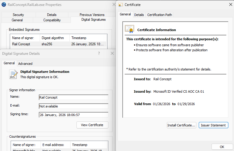 Every RailLab executable binary published by Rail Concept is signed either by Rail Concept or Microsoft itself